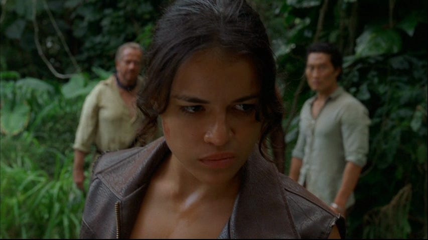 As this drama unfolds, we receive Ana Lucia’s backstory: she’s an LA cop who suffered a near-fatal shooting in an unguarded moment, and who now is quite understandably psychologically traumatized and paranoid. Less understandably, she still wants to carry a gun and drive a beat, even though she’s clearly psychologically unfit and far too eager to draw her weapon. More understandably but far less legally, she also has dispensed some premeditated vigilante justice to her assailant, executing him in cold blood—but not before revealing that she had been pregnant when he shot her. So we have yet another character who has murder in their backstory,4 and we are not even close to done adding to that number today.