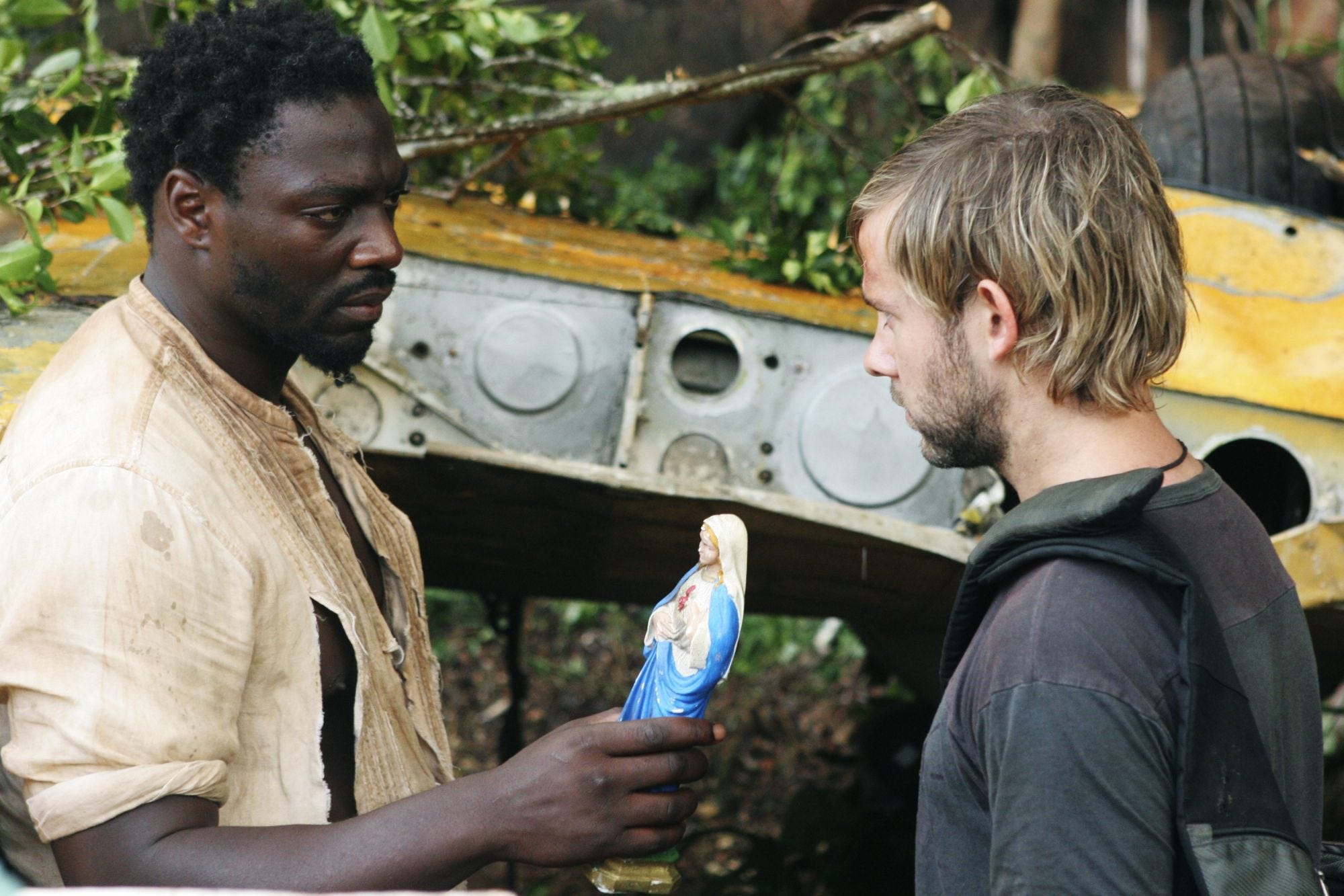 In flashbacks we soon learn why Eko is so consumed: in a previous life this clearly dangerous but deliberately peaceful man was a murderous (take a drink) Nigerian warlord, conscripted into the criminal militias as a child—a fate that he took upon himself to spare his younger brother, Yemi. In adulthood, Yemi has become a priest, and the notorious Mister Eko returns to pressure him for assistance in his current scheme; he and his gang intend to pose as priests to transport a large shipment of heroin out of the country, hidden inside icons of Mary, on a flight disguised as a relief mission. Yemi alerted the military but ran ahead to warn Eko and got shot in the resulting melee. Eko’s colleagues abandoned him on the tarmac, and Eko, mistaken for his brother by the military, has been posing as a priest ever since. The last time he saw his brother, Yemi was bleeding to death, bundled into a Beechcraft plane full of statues just like the one he’s now holding.