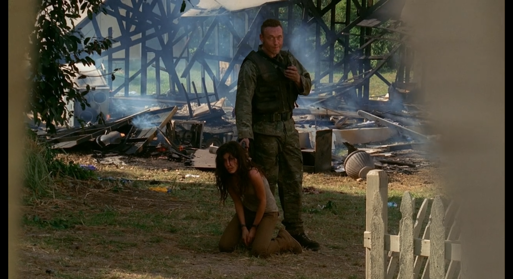 Ducking behind "cover" like picnic tables and 2-foot-high picket fences and swing sets, Sawyer tries to get to Claire's cabin as these crack shots miss him and miss him and miss him, but he's not as fast as the rocket the murder soldiers fire. Boom goes Claire's house. Miraculously unhurt Sawyer finds a miraculously unhurt Claire in the wreckage and bravely boosts her back to the barricaded Bengalow. Bravo!