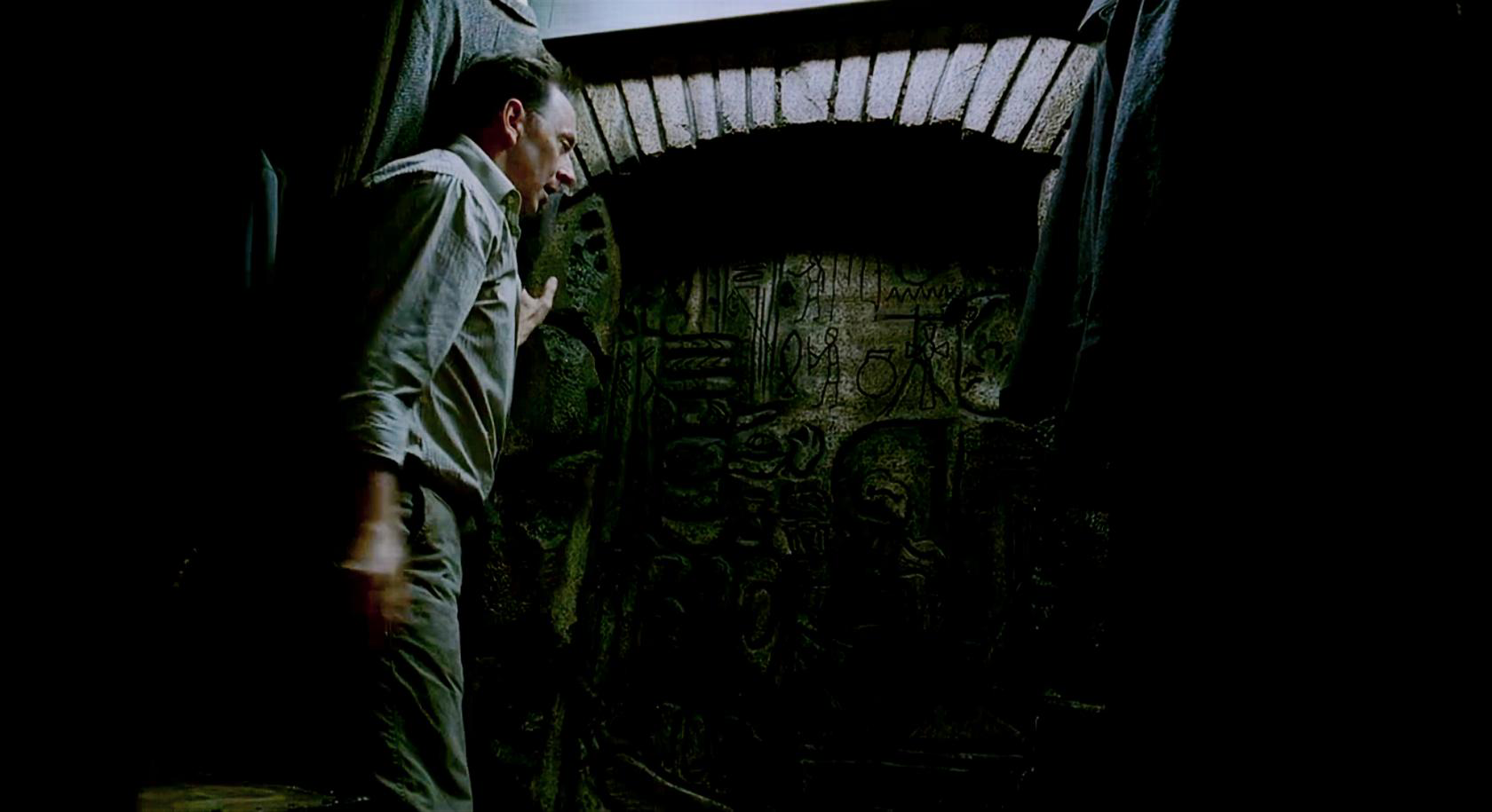 This seems to bring him back to himself. He stands and, before anyone can stop him, darts into his hidden spy room, lowers a blast door, and then opens a door to a hidden room within his hidden room, which is the most Ben Linus thing I've ever seen. The door is covered with hieroglyphs and whatnot, which is (I think) the first we've seen of that sort of thing, but it's certainly not going to be the last. In goes Ben Linus, a man whose inner sanctum has an inner sanctum.