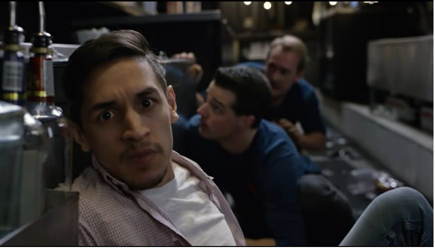The person playing what I’ll call “pinned down man” is behind the bar with two other men. He looks at the camera, and he says this: “I’m not a victim. I’m ready for this. I’ll go for the gun, he’ll go for the arms, the bartender will go for the head.”